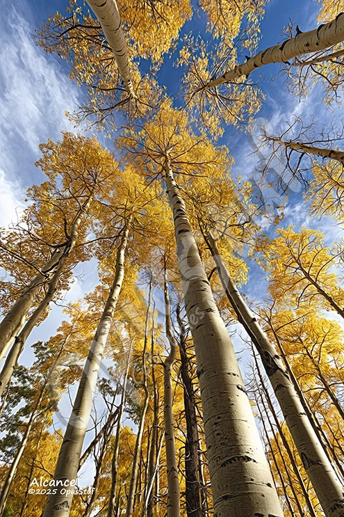 This photograph, Alcanse (reach), is a salute to the beauty of the Aspen forest northeast of Santa Fe, New Mexico. It’s a bit of a mind boggle to think about the fact that these majestic trees share a common root system over such a vast area. That’s an enormous organism. The glory of this forest presents itself in the autumn of each year with an intense color burst. The color only lasts for a week or two, so huge flocks of people gather in various locations to view and photograph themselves with the trees during the peak of the color. A large metal print of this image will be a massive presence wherever it is displayed.