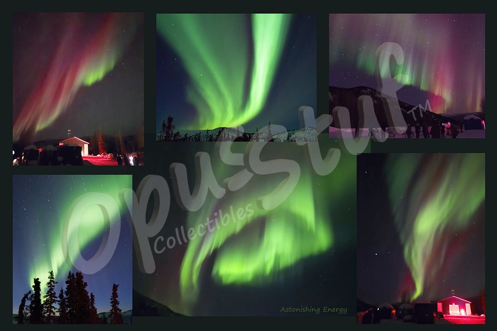 “This is a collage of photographs of the Aurora Borealis we took from Chena Hot Springs, Alaska near Fairbanks. It shows astonishing amounts of light energy derived from electrons blasted through the electromagnetic North Pole on a cloud free night in March 2025. The most common are lime green ribbons of light, less common red ribbons and even more rare blue ribbons of light. Sometimes they oscillate and sometimes they are stationary. Auroras are visible near the north pole and the south pole on Earth and also on other planets as well. These images show only one example of the types of energy in our universe. Astonishing!”