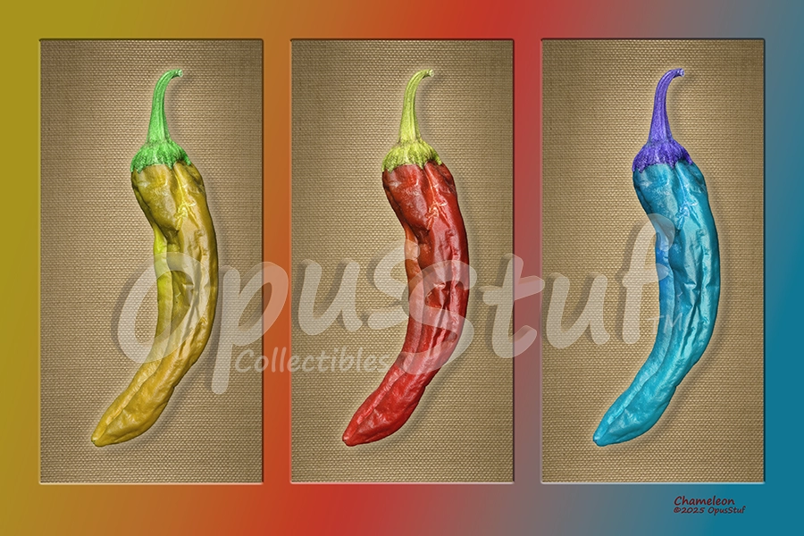 The chameleon of chile peppers? Red, green and yellow are common, but blue? Why not. The idea is to get a little attention and add some color to a wall. If someone asks about the blue, just reply that this is a special variety that comes in mild, hot and cold. This pepper was actually only 3 or 4 inches long, grown in a portable cart garden. It’s from a variety of chile pepper in New Mexico named Big Jim. In this case, “Mini Jim” might be more appropriate. Big Jim chiles often grow to a foot long or sometimes even longer, and are a medium hot flavor. Chile is endemic to New Mexico and its people to the extent that the state question at a restaurant is, “Red or green?” Chameleon does not do green, because that’s boring.