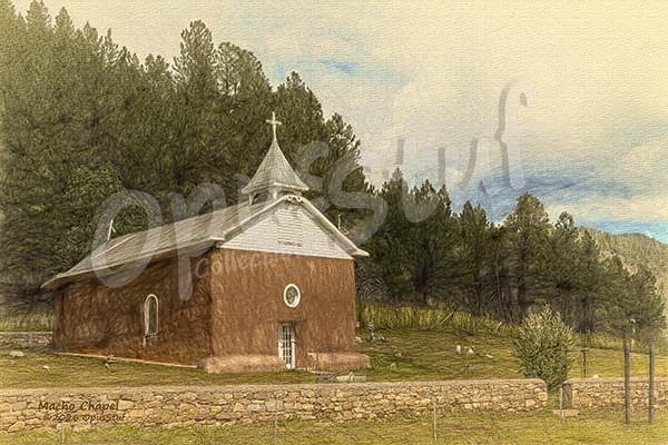 Macho Chapel is located a few miles north of Pecos, New Mexico. The original church was a small structure built in the 1830’s. The building was updated to the current structure in 1858 by Spanish-American colonists. It has also been called the Nuestra Senora de Guadalupe Mission church or San Antonio-El Macho. This image is best printed on canvas or coldpress fine art paper. Print it big enough to make the sketchy art style visible. Blends well with a raffia or rattan theme.