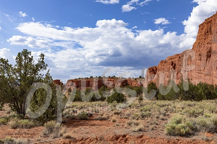 San Diego Canyon in New Mexico extends from Jemez Pueblo north through Jemez Springs to La Cueva. The scenic drive along New Mexico state road 4 runs the length of the canyon, with towering red sandstone walls in the southernmost section. This photograph was made in July 2018 on a bright, sunny day with beautiful skies. The setting is right across the road from the Walatowa Visitor Center and Convenience Store. Driving in from the south, the view appears almost suddenly as the road turns and enters this section of the canyon. It’s an unexpected and impressive site. The vibrant color of the red sandstone cliffs and canyon floor are even more saturated after a rain storm. The red sandstone and clay in this geographic layer also appears in other nearby locations.