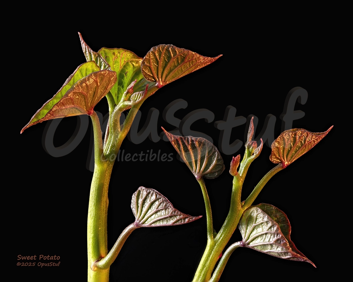 Glorious in their tiny world, the sprouts from a sweet potato take on an almost alien appearance. They could perhaps serve as an image of plant life on the planet Venus in a sci-fi movie. The forms that nature gives plant life during their development never cease to amaze. The section of the sprouts in this image was only and inch or so tall. But viewed up close, one can imagine them being 5 or 6 feet tall. Sweet Potato is an attention getter wherever it is displayed.