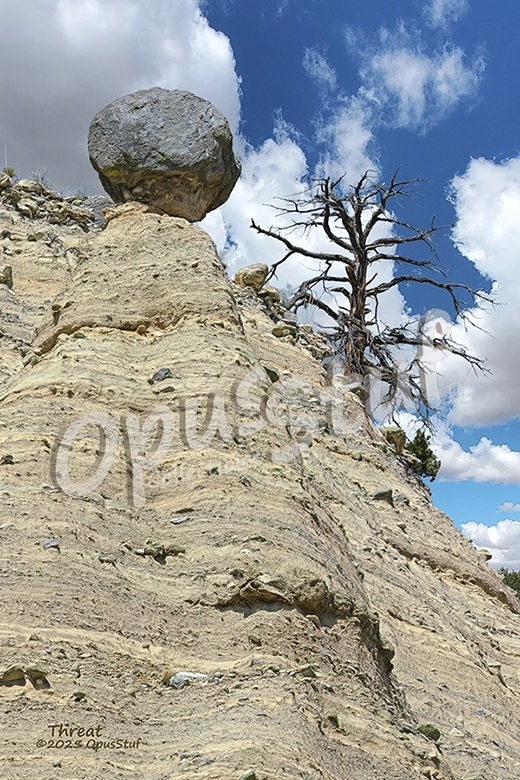 “Whoa, better keep an eye on this one.” Walking the path below this balancing marvel creates a bit of an uneasy feeling. Looking up 80 or 90 feet to this natural marvel, it appears that there is little or nothing keeping the boulder from rolling down the slope. This is one of many “hoodos”* in the Kasha-Katuwe Tent Rocks National Monument. Volcanic activity millions of years ago and erosion since then has produced some uncanny rock formations. This particular formation is one of the taller ones in the monument where the caprock is still in place. Erosion continues and at some time in the future the caprock on this one will fall down, at which time the value of this image will go up. This photograph was made in March 2010.