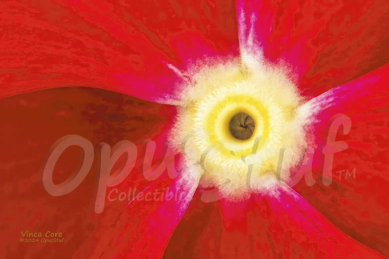 The fact is that Vincas are a sun loving, nectar provider for bees and hummingbirds. The teethy looking entity inside the core is the pollen sac and components for seed production and reproduction. The plant is also called a periwinkle, a fun name that suggests happiness. So much for scary, embedded bugs. Like most plants, the intricate structure of the Vinca core is a fascinating work of art by mother nature, surrounded by a blanket of saturated color. This image is the “bee’s eye view.”